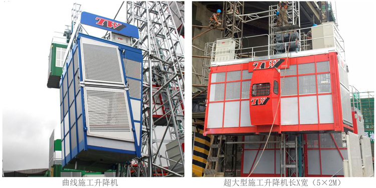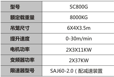 SC系列特殊机型 SC800G双柱施工升降机: 1.采用双导轨结构,升降机采用变频控制,运行平稳 2.特制限速装置,实现一个限速器两端同步制停 3.超大型吊笼,用于运体积大、重量重货物