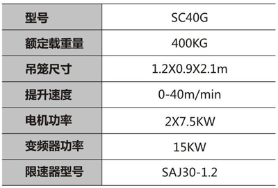 SC40G工业施工升降机: 1.用于塔吊、冷却塔、烟囱、港口等建筑 2.采用双电机保证使用安全性 3.不绣钢吊笼结构,防腐耐用美观
